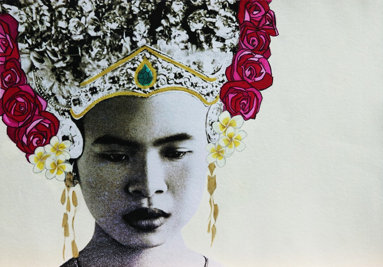 Impressions of Balinese ladies mixed media on handwoven Ikat fabric glued on canvas.